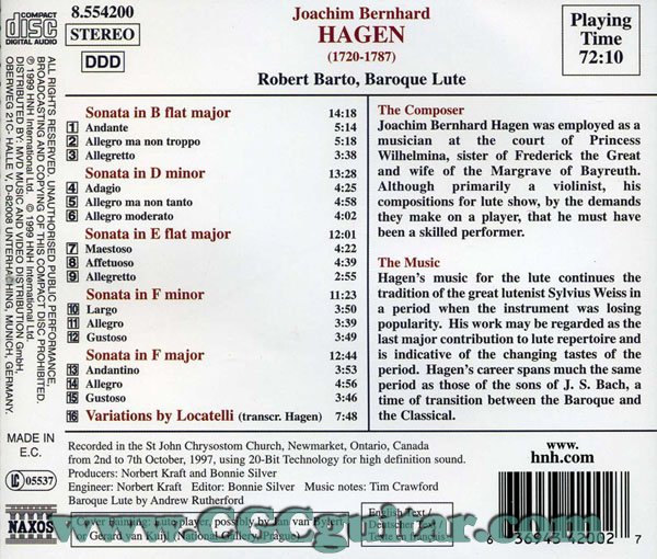 Joachim Bernhard Hagen曾是一名小提琴演奏家,曾任职宫廷音乐家为公主演奏;他的鲁特琴作品是鲁特琴音乐宝库中最后一项重要贡献之一,并延续了魏斯时代的传统风格。